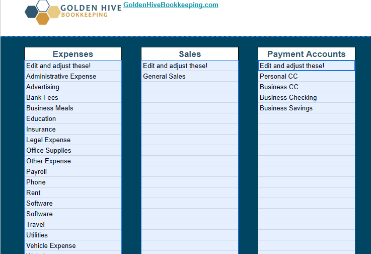 The categories tab is where you can set what categories you want to be able to access on other tabs. There are some included by default, but you'll want to adjust these to fit your business. These then will reflect on their related tabs for you to select from a drop down. You can think of this similarly to a chart of accounts. You should not adjust the header categories (Expenses, Sales, Payment accounts), but you may add, delete, or adjust any cells below them.